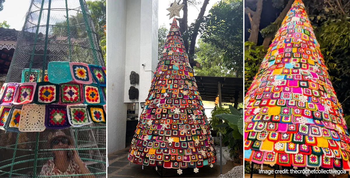 An eighteen-foot Christmas tree rose inside the Museum of Goa in India this Christmas season thanks to the efforts and skills of 25 women. The festive tree is made up of more than a thousand individually crocheted Granny Squares, each stitched together by the women of The Crochet Collective and mounted on a wire frame designed and donated by one generous civil engineer. It shone as an example of creativity and community brought together by crochet.