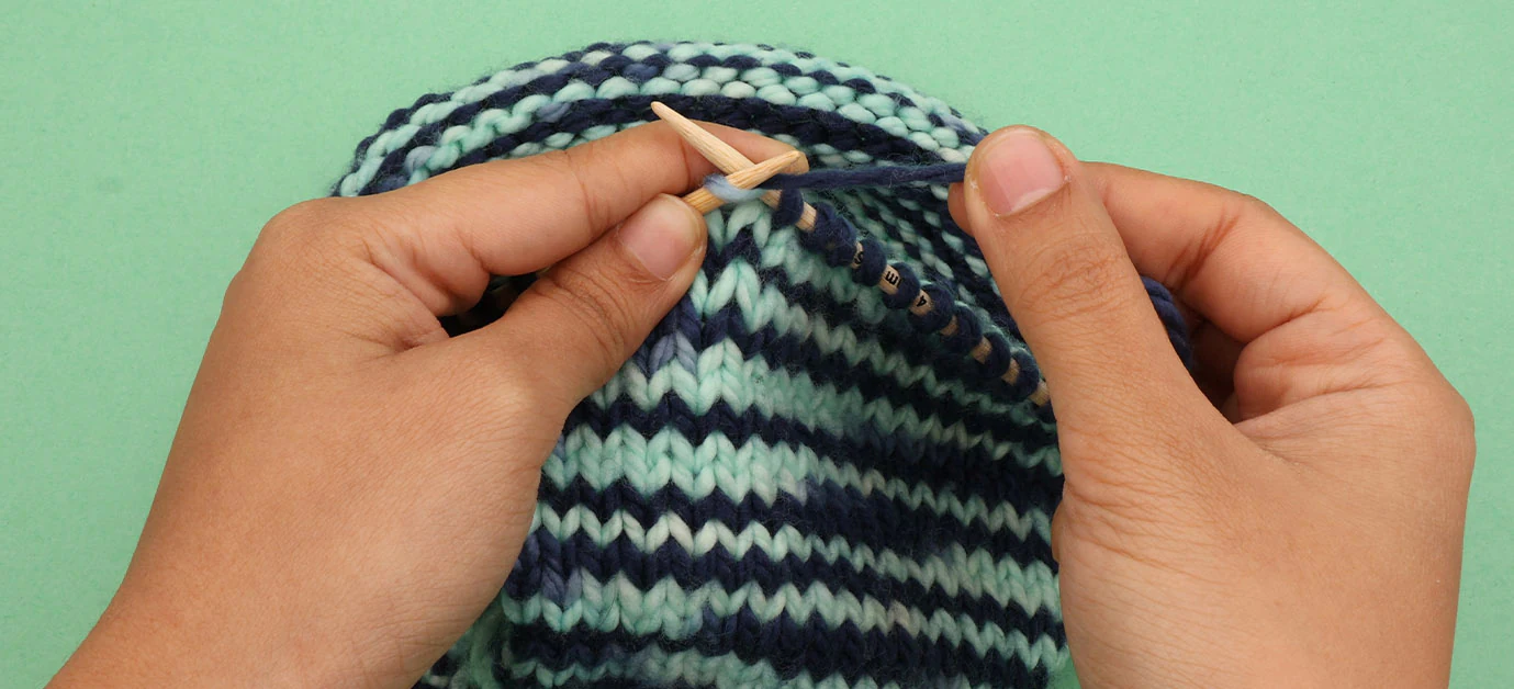 Puedes elegir un borde similar al del montaje para asegurar un efecto similar en ambos extremos. Tanto si tejes un punto elástico como un punto musgo, puedes trabajar con las mismas agujas que hayas usado para todo el proyecto.